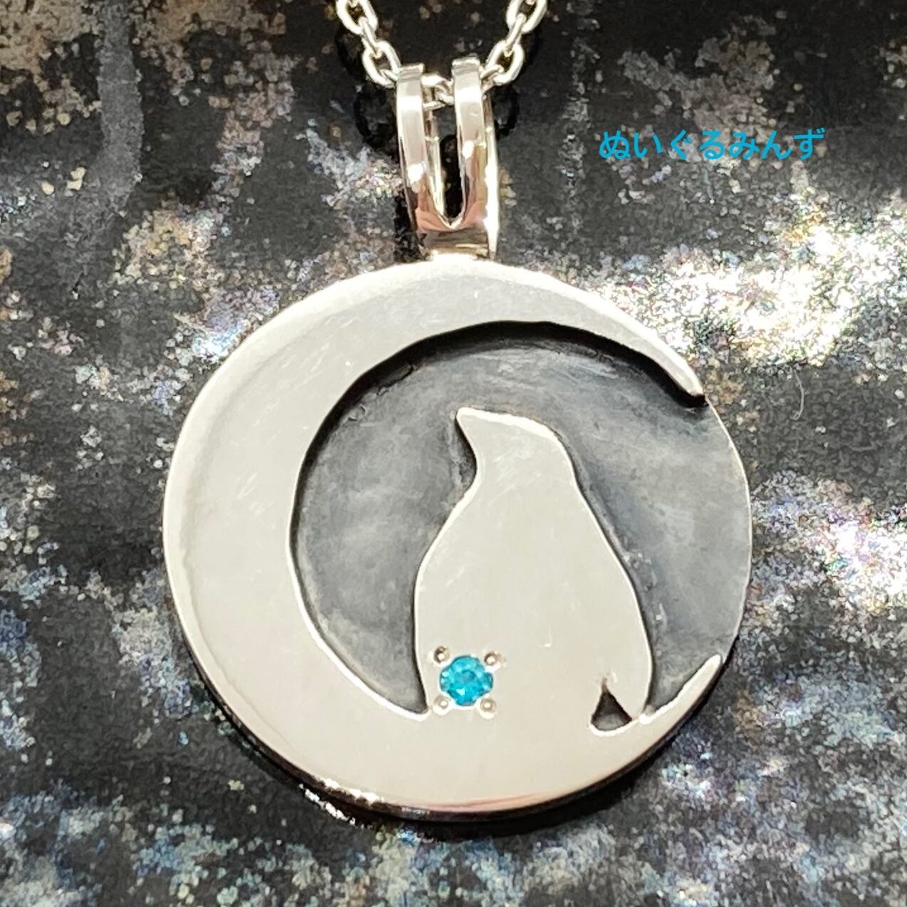 月の下のペンギンシルバー刻印ペンダント ライトブルーCZ 誕生石、天然石オーダー可